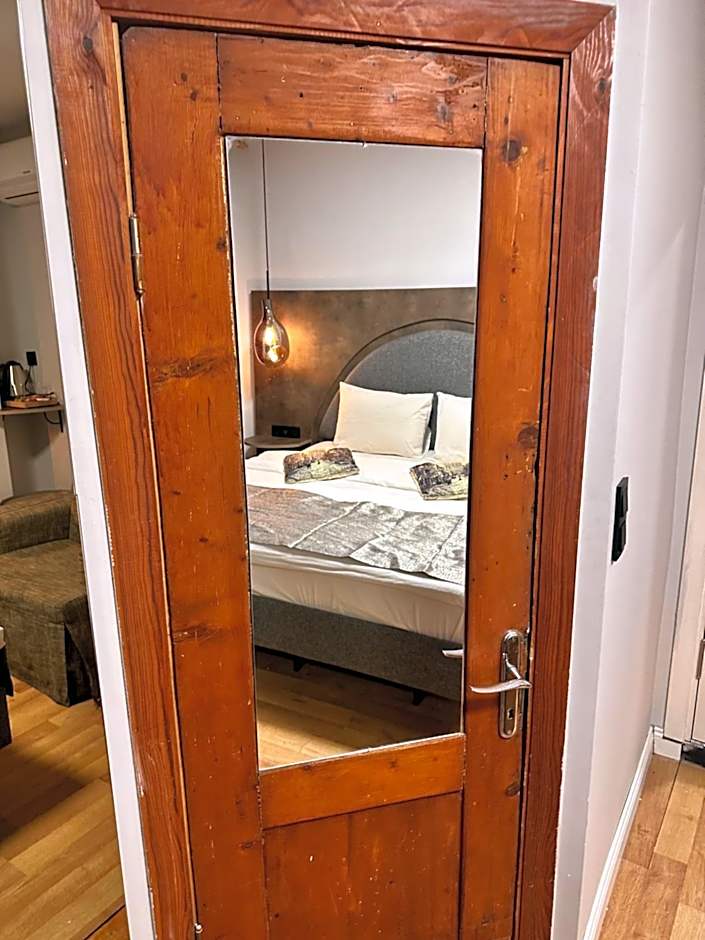 Decorated in Istanbul theme with posters and printed pillows, this room includes air conditioning, electric kettle, a mini refrigerator and a modern bathroom. It also features a floor decoration with antiques and lights under a glass.